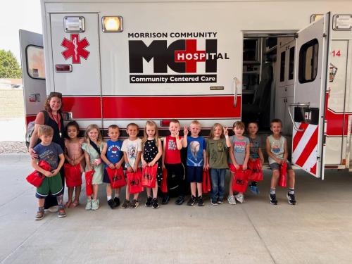 Morrison Community Hospital owns and operates its own ambulance services within the Morrison Community Hospital District. Morrison Community Hospital Ambulance Services is staffed 24/7 and consist of 911 response, emergency and non-emergency transfers, special event standby’s, community education, and prevention activities. One of those annual events is a tour of our hospital and a visit inside the ambulance for our Northside School Kindergarten classes. Pictured here is Ms. Connelly and her class.